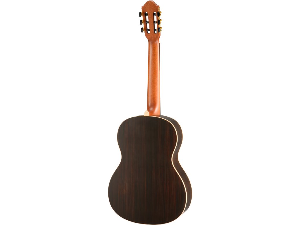 Zadní deska a luby z palisandru zajišťují hlubší tónovou odezvu, zatímco krk z mahagonu a palisandrový hmatník přinášejí příjemný herní komfort. Styl doplňují zlato-černé ladicí mechaniky a decentní rozetka.